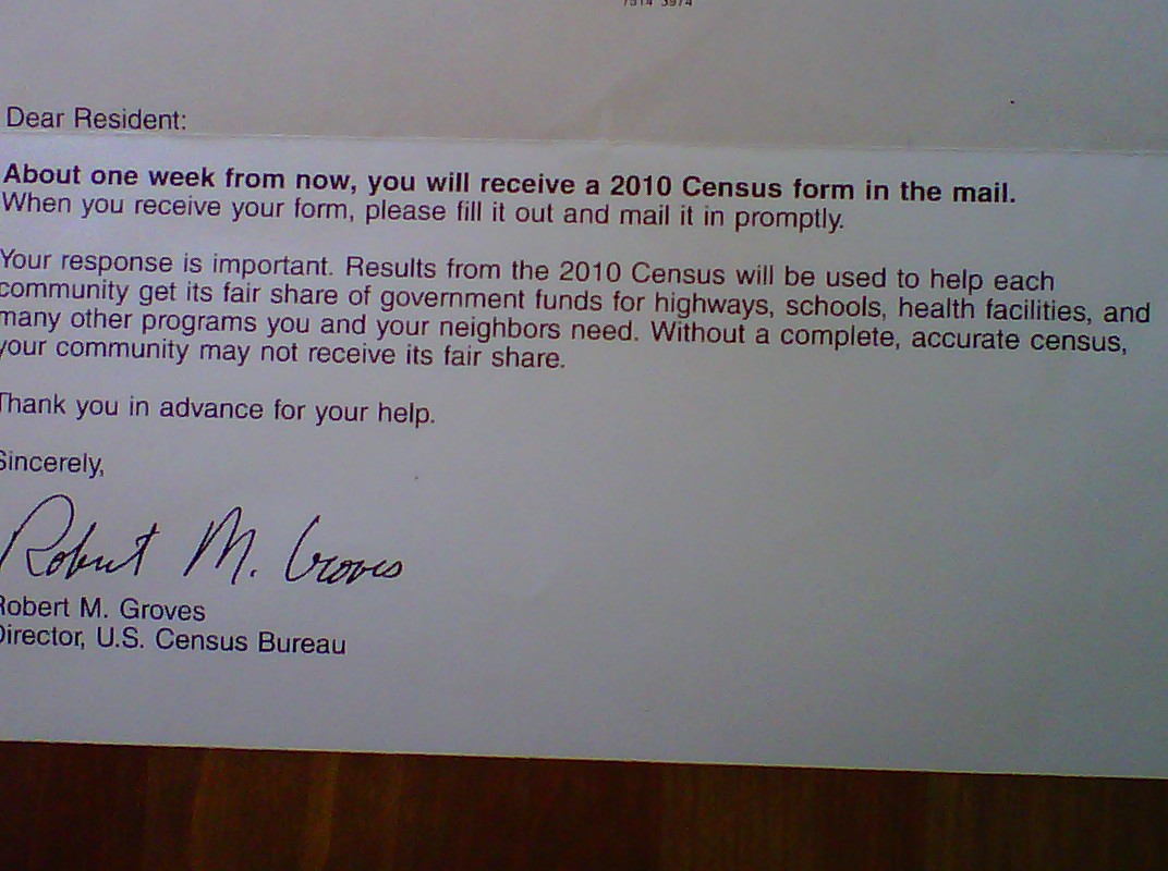Thanks for the warning, Bobby! I was concerned–freightened, in fact–that I might unexpectedly receive a Census form and not know what to do with it. If the idiocy of this mailer weren’t enough, then what irritates me further is its cordial invitation to plunder a “fair share.” In case the picture is too out of focus to read, I’ll type out my invitation from Robert M. Groves:
