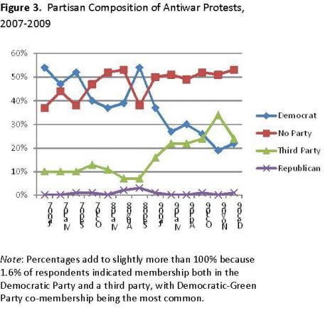 The key argument is that the decline of the antiwar movement can be attributed, in part, to the fact that Democrats have stopped using the peace movement as a platform for anti-Bush sentiment. In other words, at its peak, the ranks of the antiwar movement were swelled by partisans. Once Obama won the presidency, and other issues emerged, the movement shrank when Democrats stopped showing up.