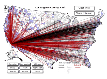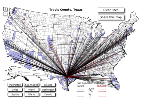 They move to freestyle Texas and away from the Regulatory Republic of California. Ryan Streeter at the Enterprise blog has the details and he’s pulled some nice still shots from an interactive map at Forbes to illustrate the trend. Black lines indicate incoming migration to a specific county, while red lines indicate outward movement. Here’s a comparison of Travis County, TX, with Los Angeles County, CA: