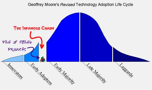 Missing in all this is anything resembling persuasion based on reason and deliberation, least of all glorified focus groups. If reason and deliberation about the facts ruled, this kind of snowballing up and out for new products would be rare. Instead it would be much better to have everyone meet for “product deliberation day” and decide which new products to adopt. But tastes and preferences don’t change that way. Creating a new market, even for demonstrably higher quality goods, is difficult. And in general younger generations are quicker to adopt new technologies than the older crowd. Geoffrey Moore wrote the locus classicus on the pattern. It’s called Crossing the Chasm. He noticed that for a lot of high technology products, chronology matters in customer development. It’s a story best told by his now famous adoption curve: